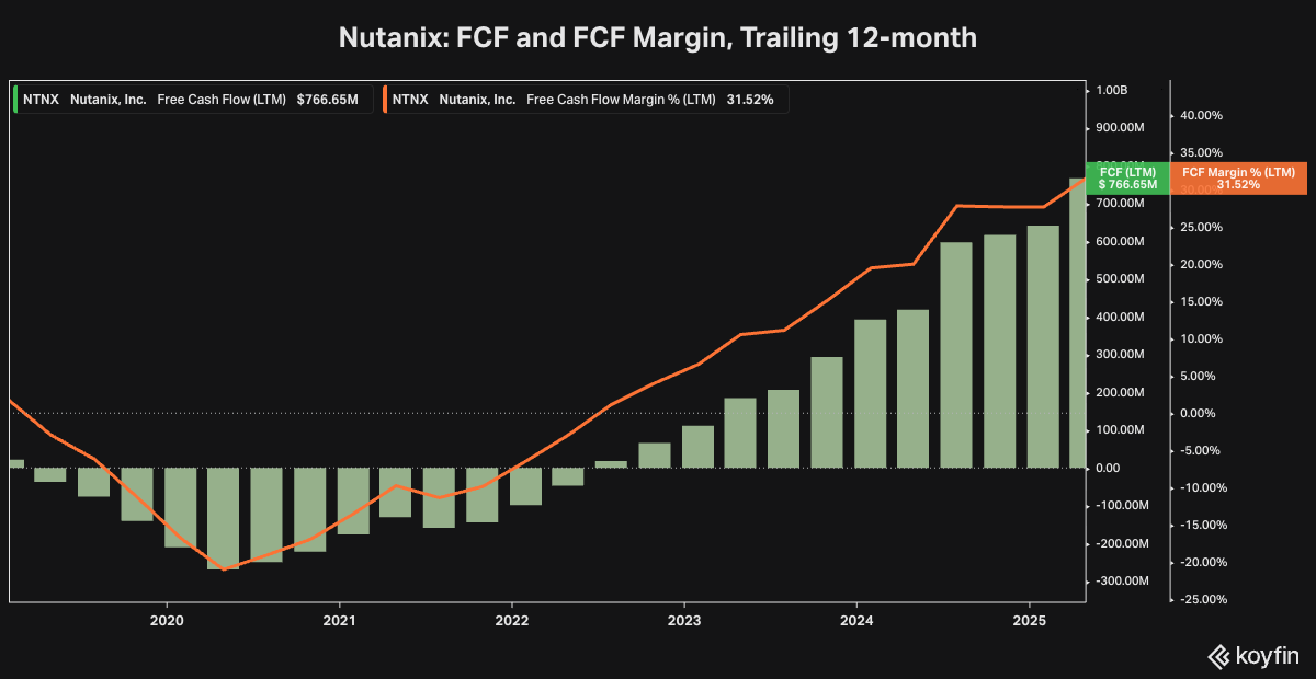 This growing operating leverage is best visible in the FCF story for Nutanix. As shown in the image below, Free cash flow has exploded from barely positive territory in 2021 to over $765 million on a trailing twelve-month basis, with FCF margins expanding to over 31%. This isn't just revenue growth—it's profitable revenue growth with expanding returns on capital.