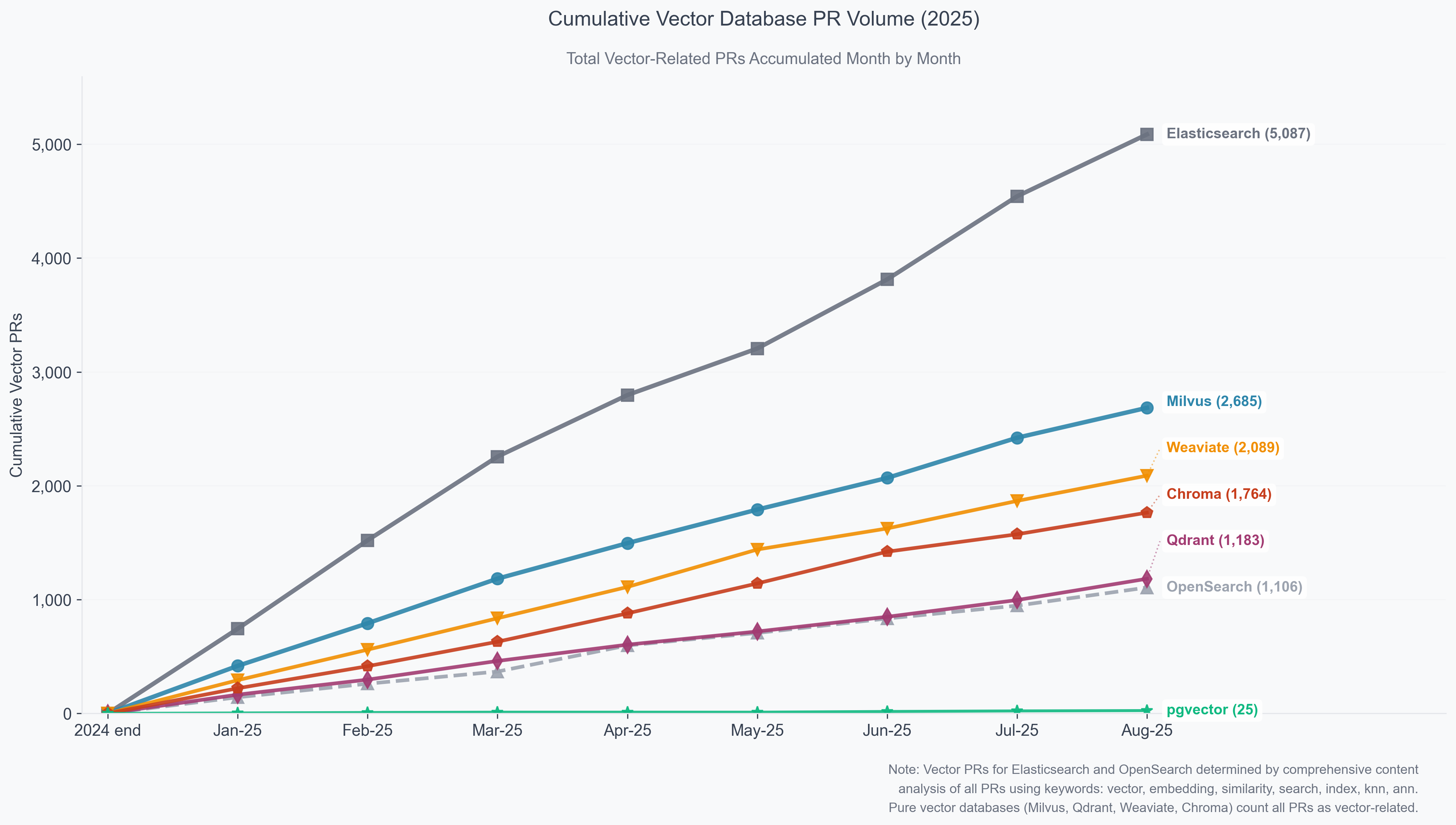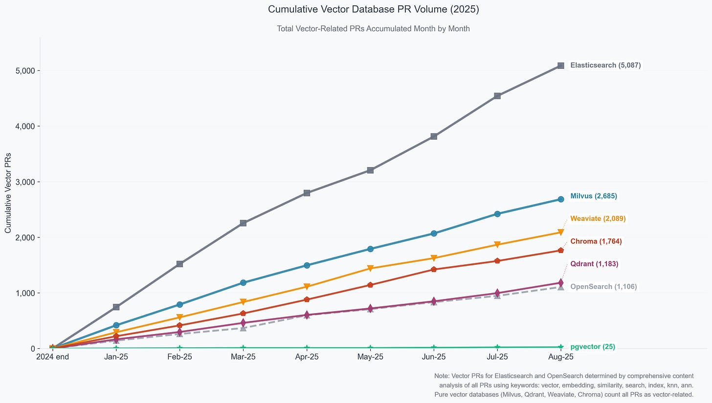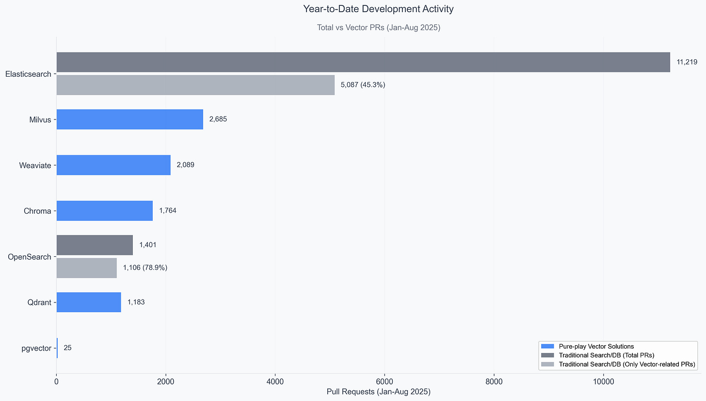 Elasticsearch demonstrates remarkable overall development velocity with over 5K PRs related to vector search (11,219 total PRs) from January through August 2025. In fact it is the largest vector development effort in the ecosystem, demonstrating massive strategic investment in AI infrastructure capabilities
