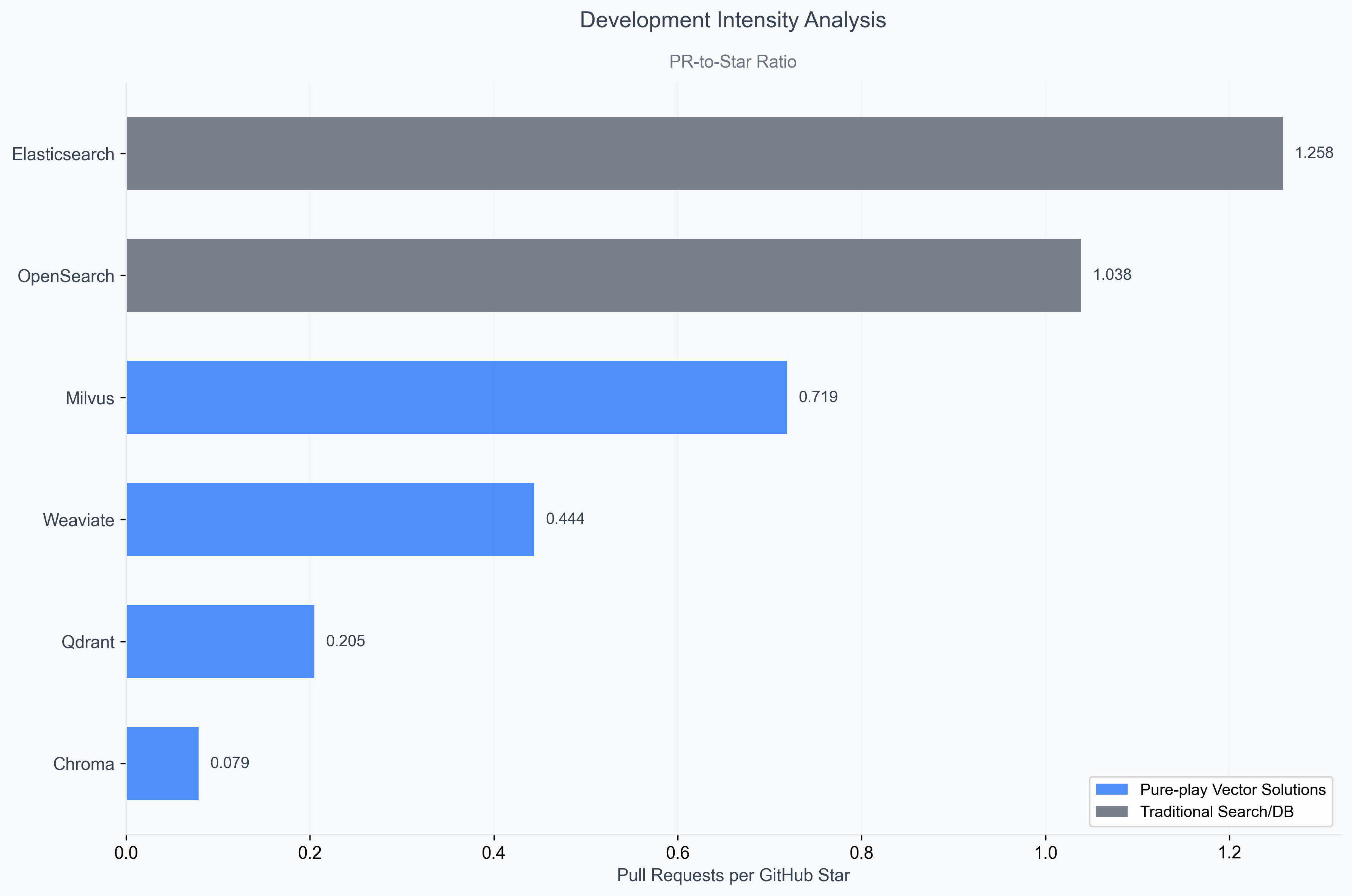 Interestingly, Elasticsearch even maintains a significant development velocity advantage over OpenSearch despite both platforms sharing similar technical foundations, with Elasticsearch's 1.258 PR-to-star ratio substantially exceeding OpenSearch's development intensity, suggesting the original platform continues to attract greater engineering investment and community contribution activity.
