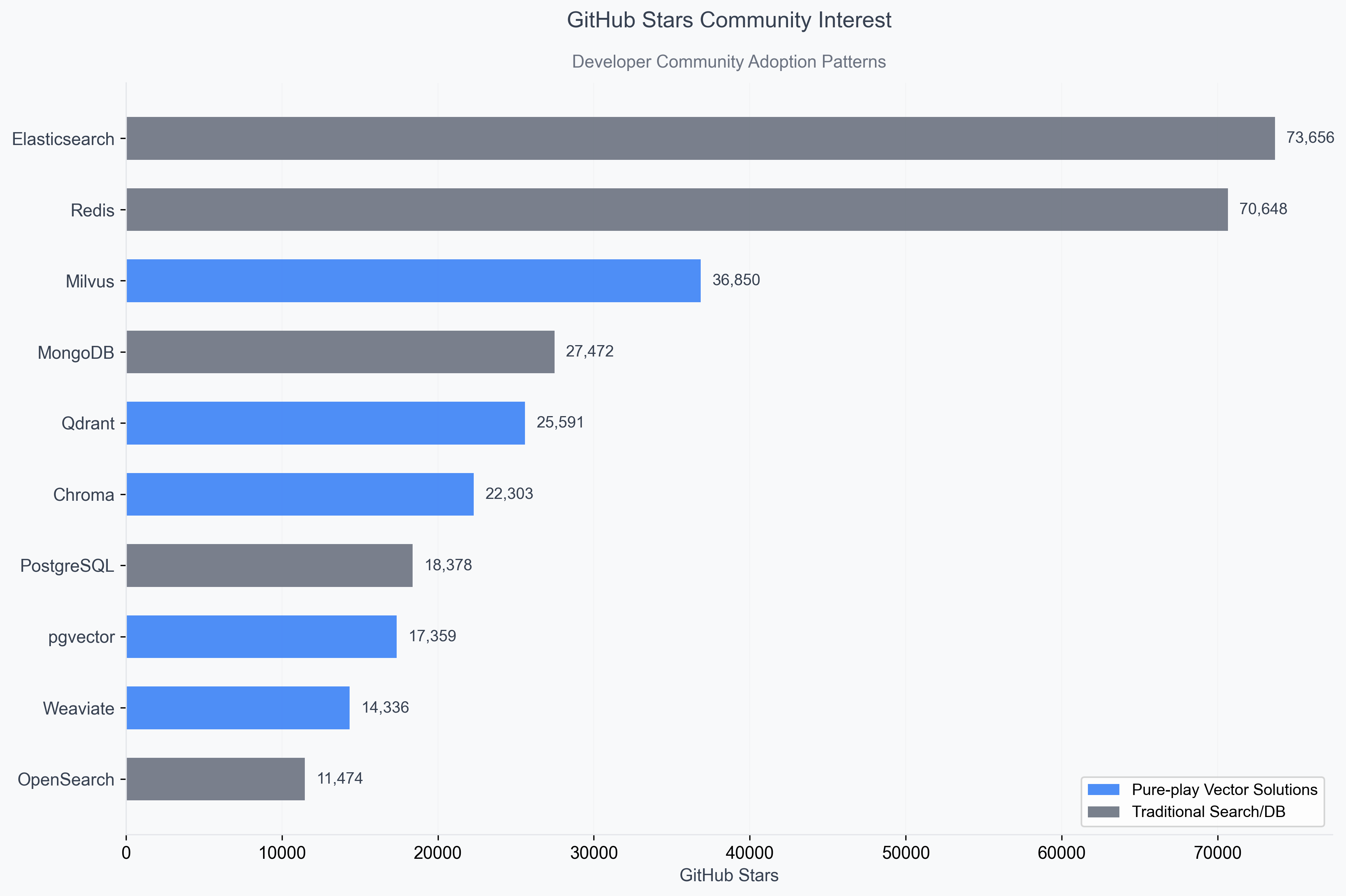 However, the pure-play category shows remarkable momentum: Milvus has achieved 36,963 stars since 2019, surpassing MongoDB's 27,494 stars despite being a decade newer.